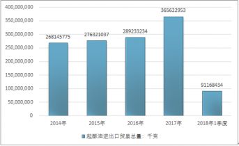 2016年我國起酥油進(jìn)出口貿(mào)易總量289233234千克 ,2017年進(jìn)出口貿(mào)易總量365622953千克 ;2019年1季度進(jìn)出口貿(mào)易總量91168434千克 。