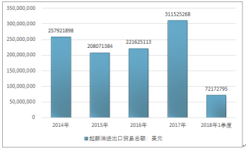 2016年我國起酥油進(jìn)出口貿(mào)易總額221625113美元,2017年進(jìn)出口貿(mào)易總額311525268美元;2019年1季度進(jìn)出口貿(mào)易總額72172795美元。