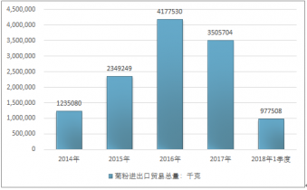 2016年我國(guó)菊粉進(jìn)出口貿(mào)易總量4177530千克,2017年進(jìn)出口貿(mào)易總量3505704千克;2019年1季度進(jìn)出口貿(mào)易總量977508千克。