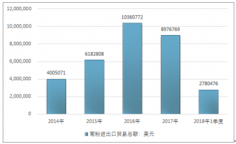 2016年我國(guó)菊粉進(jìn)出口貿(mào)易總額10360772美元,2017年進(jìn)出口貿(mào)易總額8976769美元;2019年1季度進(jìn)出口貿(mào)易總額2780476美元。