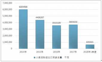2016年我國小麥淀粉進(jìn)出口貿(mào)易總量3553109千克,2017年進(jìn)出口貿(mào)易總量3693630千克;2019年1季度進(jìn)出口貿(mào)易總量635501千克。