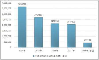 2016年我國小麥淀粉進(jìn)出口貿(mào)易總額2150754美元,2017年進(jìn)出口貿(mào)易總額2084501美元;2019年1季度進(jìn)出口貿(mào)易總額427184美元。