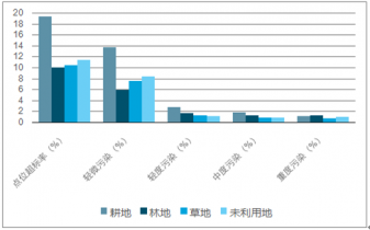 從土地類型來看,耕地的點(diǎn)位超標(biāo)率最高,達(dá)到了19.4%,而其他三種土地的超標(biāo)率略高于10%的水平。耕地直接涉及到我國的食品安全問題,這也是近年來土地污染問題越來越受到群眾關(guān)心的重要原因。