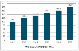 隨著電子商務(wù)的普及,國(guó)人的消費(fèi)模式與消費(fèi)習(xí)慣開始發(fā)生改變,疊加居民收入水平提高,三四線城市居民對(duì)化妝品的需求顯著提升,我國(guó)人均化妝品消費(fèi)由2010年的69.3元增長(zhǎng)至2017年的180.9元。
