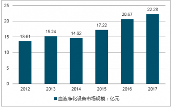 2017年,中國血液凈化設(shè)備市場規(guī)模達(dá)到22.28億元,同比增長7.79%。