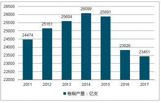 2017年1-12月止累計中國卷煙產量為23450.7億支,同比下降1.6%。2016年中國卷煙產量為23825.8億支,同比下降8%。