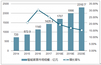 在人工智能和物聯(lián)網(wǎng)技術(shù)的發(fā)展帶領(lǐng)下,智能家居蓬勃興起,互聯(lián)網(wǎng)巨頭及新興創(chuàng)業(yè)公司從硬件、技術(shù)、系統(tǒng)解決方案等不同角度進(jìn)行布局,智能家居系統(tǒng)初顯。隨著人工智能技術(shù)的不斷完善,智能家居產(chǎn)品種類日益增多,預(yù)計2017年中國智能家居市場規(guī)模將超1400億元,達(dá)到1428億元,增長率為25.3%,雖增長或有所放緩,但市場規(guī)模將保持持續(xù)穩(wěn)定增長,2020年將市場規(guī)模將突破2000億元。