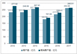 2017年中國(guó)錫產(chǎn)值為262.88億元,同比增長(zhǎng)20.98%;2016年中國(guó)錫產(chǎn)值為217.29億元。2017年中國(guó)錫消費(fèi)產(chǎn)值為265.51億元,同比增長(zhǎng)16.24%;2016年中國(guó)錫消費(fèi)產(chǎn)值為228.41億元。