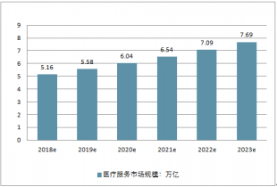 預計2019年至2023年我國醫(yī)療服務行業(yè)市場規(guī)模將持續(xù)保持增長,預計2020年將超過6萬億市場規(guī)模,2023年將達到7.69萬億。