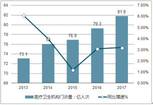 2017年,全國(guó)醫(yī)療衛(wèi)生機(jī)構(gòu)總診療人次達(dá)81.8億人次,比上年增加2.5億人次(增長(zhǎng)3.2%)。2017年居民到醫(yī)療衛(wèi)生機(jī)構(gòu)平均就診5.9次。
