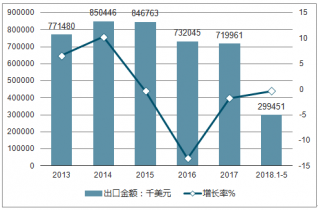 2019年1-5月中國煙花、爆竹出口金額為3億美元,同比下降0.3%;縱觀近五年中國煙花、爆竹出口金額情況,年均復(fù)合增長率為-1.17%。