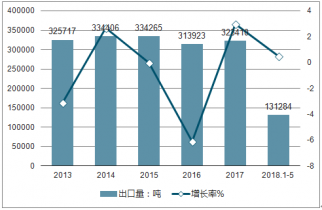 2019年1-5月中國出口煙花、爆竹13.13萬噸,同比微增0.5%;縱觀近五年中國煙花、爆竹出口數(shù)量情況,年均復(fù)合增長率為-0.18%。