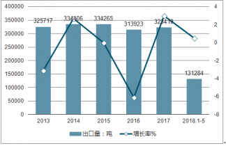 2019年1-5月中國出口煙花、爆竹13.13萬噸,同比微增0.5%;縱觀近五年中國煙花、爆竹出口數(shù)量情況,年均復(fù)合增長率為-0.18%。