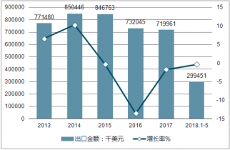 2019年1-5月中國煙花、爆竹出口金額為3億美元,同比下降0.3%;縱觀近五年中國煙花、爆竹出口金額情況,年均復(fù)合增長率為-1.17%。