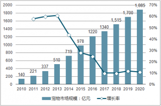 2010-2020年中國(guó)寵物行業(yè)市場(chǎng)規(guī)模及增長(zhǎng)率走勢(shì)