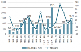2017-2019年各月中國紙煙出口數(shù)量及增長率走勢