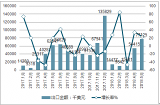 2017-2019年各月中國紙煙出口金額及增長率走勢