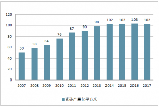 2007-2017年全國(guó)瓷磚產(chǎn)量(單位:億平方米)