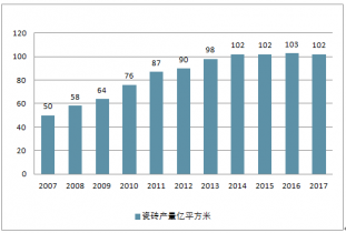 2007-2017年全國瓷磚產(chǎn)量(單位:億平方米)