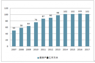 2007-2017年全國瓷磚產(chǎn)量(單位:億平方米)