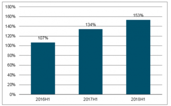 2018上半年中央空調(diào)市場規(guī)模為420億元,同比增長9.8%,較去年同期增速大幅下滑。其中家裝零售市場規(guī)模為170.8億元,同比下降2%;工裝市場規(guī)模306.9億元,同比增長23%。家裝市場占比近年來不斷提升,2018上半年,家裝市場占比為35.8%,工裝市場占比為64.2%。家裝市場中,主要應用的中央空調(diào)品類為多聯(lián)機、單元機和冷水機。2018上半年,多聯(lián)機占比為70.3%,單元機為25.4%,水機為4.3%。