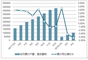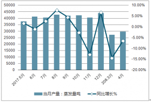 2018年4月,中國工業(yè)鍋爐產量29689.7蒸發(fā)量噸,同比減少6.4%。2018年1-4月中國工業(yè)鍋爐累計產量104937.3蒸發(fā)量噸,累計減少4.2%。