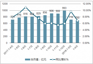 4月份,餐飲收入3024億元,同比增長9.6%;1-4月份,餐飲收入12736億元,同比增長10.1%;其中,4月份,限額以上單位商品零售10540億元,同比增長7.8%。1-4月份,限額以上單位商品零售43248億元,同比增長8.4%。