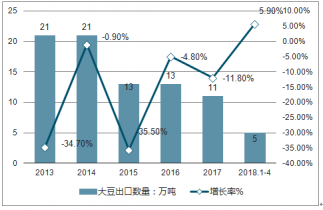 2018年1-4月中國大豆出口金額為3755.3萬美元,同比略降1.7%;縱觀近五年中國大豆出口金額情況,年均復(fù)合增長率為-18.03%。