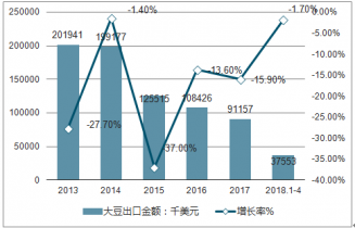 2018年1-4月中國(guó)大豆出口金額為3755.3萬(wàn)美元,同比略降1.7%;縱觀近五年中國(guó)大豆出口金額情況,年均復(fù)合增長(zhǎng)率為-18.03%。