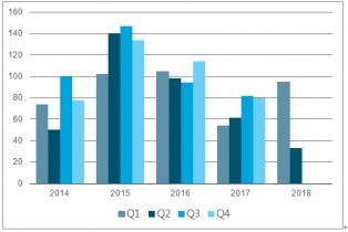 從融資數量看, 2018 年前 4 月數據同比增 80%,呈現逐步回暖趨勢。 分年度來看, 教育行業一級市場投資在 2014 至 2017 年保持高熱度。 2015 年達到頂峰 523 起,隨后兩年市場逐漸降溫,教育投資市場趨于冷靜。 2017 年以來, 教育投資大體呈現逐季度上升態勢,教育投資逐漸回暖, 2018 年數據顯示出進一步上升趨勢, 前 4 個月同比增長 80%。
