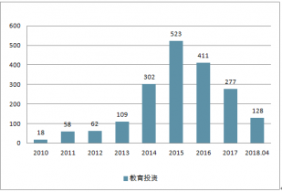 從融資數(shù)量看, 2018 年前 4 月數(shù)據(jù)同比增 80%,呈現(xiàn)逐步回暖趨勢(shì)。 分年度來看, 教育行業(yè)一級(jí)市場(chǎng)投資在 2014 至 2017 年保持高熱度。 2015 年達(dá)到頂峰 523 起,隨后兩年市場(chǎng)逐漸降溫,教育投資市場(chǎng)趨于冷靜。 2017 年以來, 教育投資大體呈現(xiàn)逐季度上升態(tài)勢(shì),教育投資逐漸回暖, 2018 年數(shù)據(jù)顯示出進(jìn)一步上升趨勢(shì), 前 4 個(gè)月同比增長 80%。