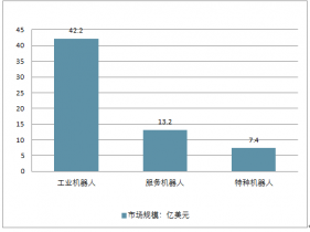 工業(yè)機器人連續(xù)五年成為全球第.一大應用市場,服務(wù)機器人需求潛力巨大,特種機器人應用場景顯著擴展,核心零部件國產(chǎn)化進程不斷加快,創(chuàng)新型企業(yè)大量涌現(xiàn),部分技術(shù)已可形成規(guī)模化產(chǎn)品,并在某些領(lǐng)域具有明顯優(yōu)勢。2017年,工業(yè)機器人是機器人市場主要產(chǎn)品,所占整體比重高達67.2%,市場規(guī)模為42.2億美元。此外,得益于互聯(lián)網(wǎng)巨頭對機器人在服務(wù)場景應用的投入,服務(wù)機器人所占比重也超過20%,市場規(guī)模達到13.2億美元。