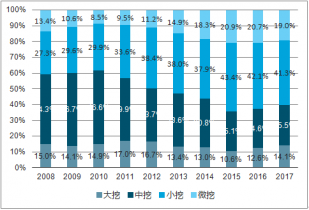 近年來,國內(nèi)施工水平和機(jī)械化水平不斷的提升,人力成本的提高,新農(nóng)村與市政建設(shè)等使小挖的份額占比不斷提高, 2017年小挖微挖占比超過60%,這在未來一段時(shí)間仍將是一個(gè)趨勢(shì)。