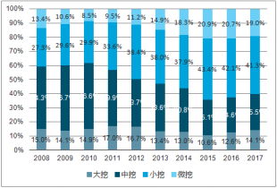 近年來(lái),國(guó)內(nèi)施工水平和機(jī)械化水平不斷的提升,人力成本的提高,新農(nóng)村與市政建設(shè)等使小挖的份額占比不斷提高, 2017年小挖微挖占比超過(guò)60%,這在未來(lái)一段時(shí)間仍將是一個(gè)趨勢(shì)。