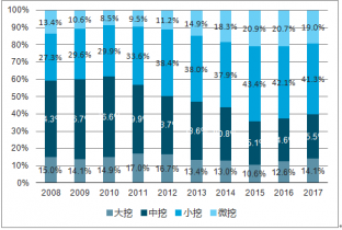 近年來,國內(nèi)施工水平和機(jī)械化水平不斷的提升,人力成本的提高,新農(nóng)村與市政建設(shè)等使小挖的份額占比不斷提高, 2017年小挖微挖占比超過60%,這在未來一段時(shí)間仍將是一個(gè)趨勢。