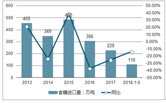 2019年1-5月,我國食糖進口數(shù)量為110萬噸,同比下滑13.5%。2013-2017年我國食糖進口量在2017年為最低值229萬噸,同比下滑25.2%;2015年為最高值達485萬噸,同比增長39%。