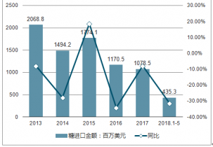 2019年1-5月,我國食糖進口金額為435.3百萬美元,同比下滑31.2%。2013-2017年我國食糖進口金額在2017年最低為1078.5百萬美元,同比下滑7.9%;2013年為最高值達2068.8百萬美元,同比下滑7.8%。