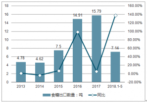 2019年1-5月,我國食糖出口數(shù)量為7.14噸,同比增長138.1%。2013-2017年我國食糖出口在2014年最低為4.62萬噸,跌幅達3.3%;2017年為最高值達15.79萬噸,漲幅達6%。