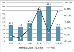 2019年1-5月,我國食糖出口金額為38.2百萬美元,同比增長76.3%。2013-2017年我國食糖進口金額在2014年最低為37.9百萬美元,跌幅達9.4%;2017年為最高值達90.6百萬美元,同比增長8.9%。