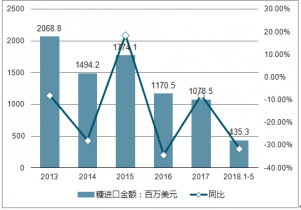 2013-2019年1-5月中國食糖進口額及增長率走勢