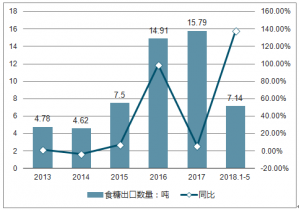 2019年1-5月,我國食糖出口數(shù)量為7.14噸,同比增長138.1%。2013-2017年我國食糖出口在2014年最低為4.62萬噸,跌幅達3.3%;2017年為最高值達15.79萬噸,漲幅達6%。