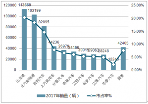 2017年國內(nèi)主要新能源乘用車廠家銷量及市占率(輛)