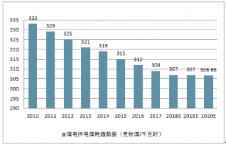 2010-2020 年全國煤電供電煤耗趨勢圖(克標煤/千瓦時)
