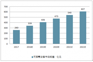 2017年中國可穿戴設(shè)備市場產(chǎn)值將超過260億元人民幣。預(yù)計到2022年我國可穿戴設(shè)備市場規(guī)模將達607億元左右。
