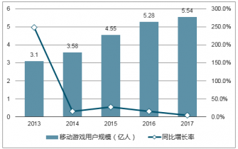 2013-2017移動(dòng)游戲用戶規(guī)模及同比增長(zhǎng)率