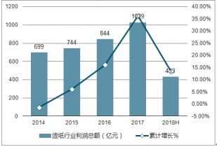 2017年全年造紙行業(yè)實(shí)現(xiàn)利潤(rùn)總額達(dá)到1029億元,同比增長(zhǎng)36.2%。到2018上半年全國(guó)造紙行業(yè)利潤(rùn)總額達(dá)433億元,相比去年同期造紙13.5%。