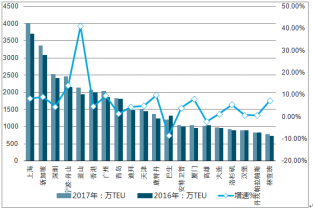 2017年全球經(jīng)濟(jì)增速為3.6%,不僅高于2008-2017年年均增速3.3%,也高于1980—2017年年均3.4%的歷史增速。受益于全球經(jīng)濟(jì)增速企穩(wěn),全球貿(mào)易環(huán)境有所改善,國(guó)際集裝箱市場(chǎng)環(huán)境回暖升溫,全球主要集裝箱港口吞吐量增速表現(xiàn)亮眼,2017年全球前20的集裝箱港口完成集裝箱吞吐量3.35億TEU,同比增速為5.6%,遠(yuǎn)高于去年1.7%的增速