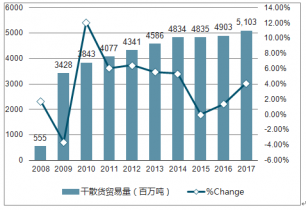 2019年1月26日,交通運(yùn)輸部公布2017年規(guī)模以上港口貨物、旅客吞吐量快報(bào)數(shù)據(jù)。數(shù)據(jù)顯示,2017年中國規(guī)模以上港口預(yù)計(jì)完成貨物吞吐量126.44億噸,同比增長(zhǎng)6.4%。其中,沿海港口和內(nèi)河港口同比增速基本持平,分別為6.4%和6.3%,完成貨物吞吐量分別為86.25億噸和40.19億噸;完成外貿(mào)貨物吞吐量40.02億噸,同比增長(zhǎng)5.7%;集裝箱吞吐量同比增長(zhǎng)8.3%至2.27億TEU,且增速明顯快于貨物吞吐量6.4%的水平。以上相關(guān)數(shù)據(jù)與2016年同期增速相比,明顯加快。