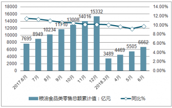 從糧油、食品類零售情況來看,2019年6月份糧油、食品類零售額達1151億元,與去年同期相比增長13%。2019年1-6月全國糧油、食品類累計零售額收入達6662億元,同比增長9.8%