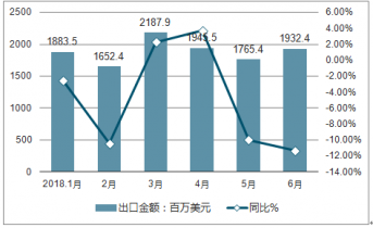6月中國液晶電視顯示板出口金額1932.4百萬美元,同比下降11.3%。1-6月中國出口集成電路金額達11307.1百萬美元,同比下降4.1%。